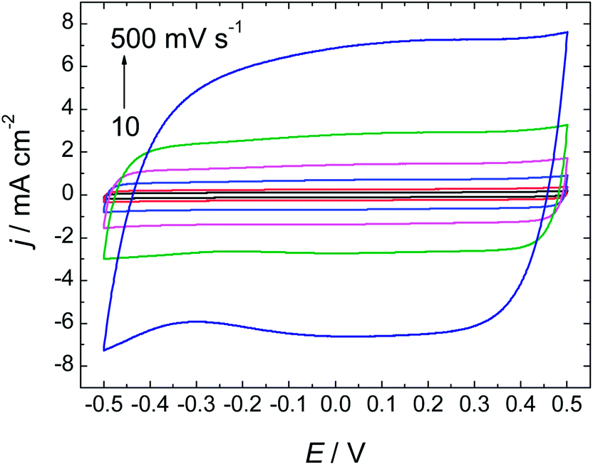 | Fig. 1 Cyclic voltammograms of the PEDOT composite film in 0.1 M KCl measured with the scan rates of 10, 20, 50, 100, 200 and 500 mV s−1. The potentials are given vs. Ag/AgCl/4 M KCl. | ||