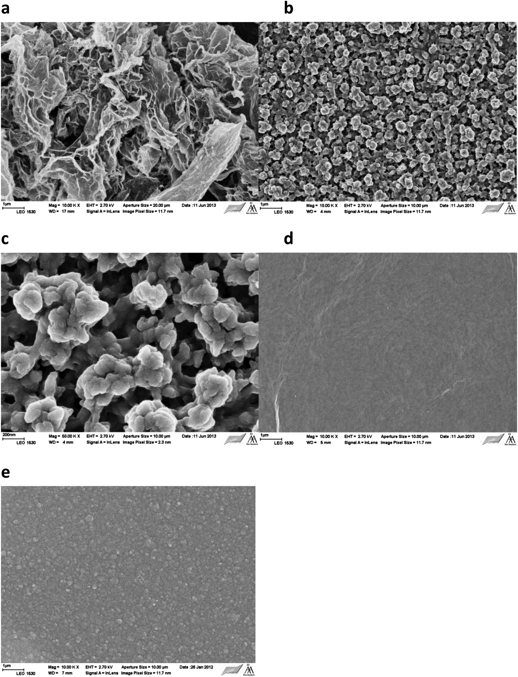 | Fig. 2  SEM images of the (a) rGO powder, (b and c) PEDOT composite, (d) PEDOT–GO and (e) PEDOT–PSS films. Magnification: 10 ![[thin space (1/6-em)]](https://www.rsc.org/images/entities/char_2009.gif) 000× except of (c) which is measured with 50 ![[thin space (1/6-em)]](https://www.rsc.org/images/entities/char_2009.gif) 000×. | ||