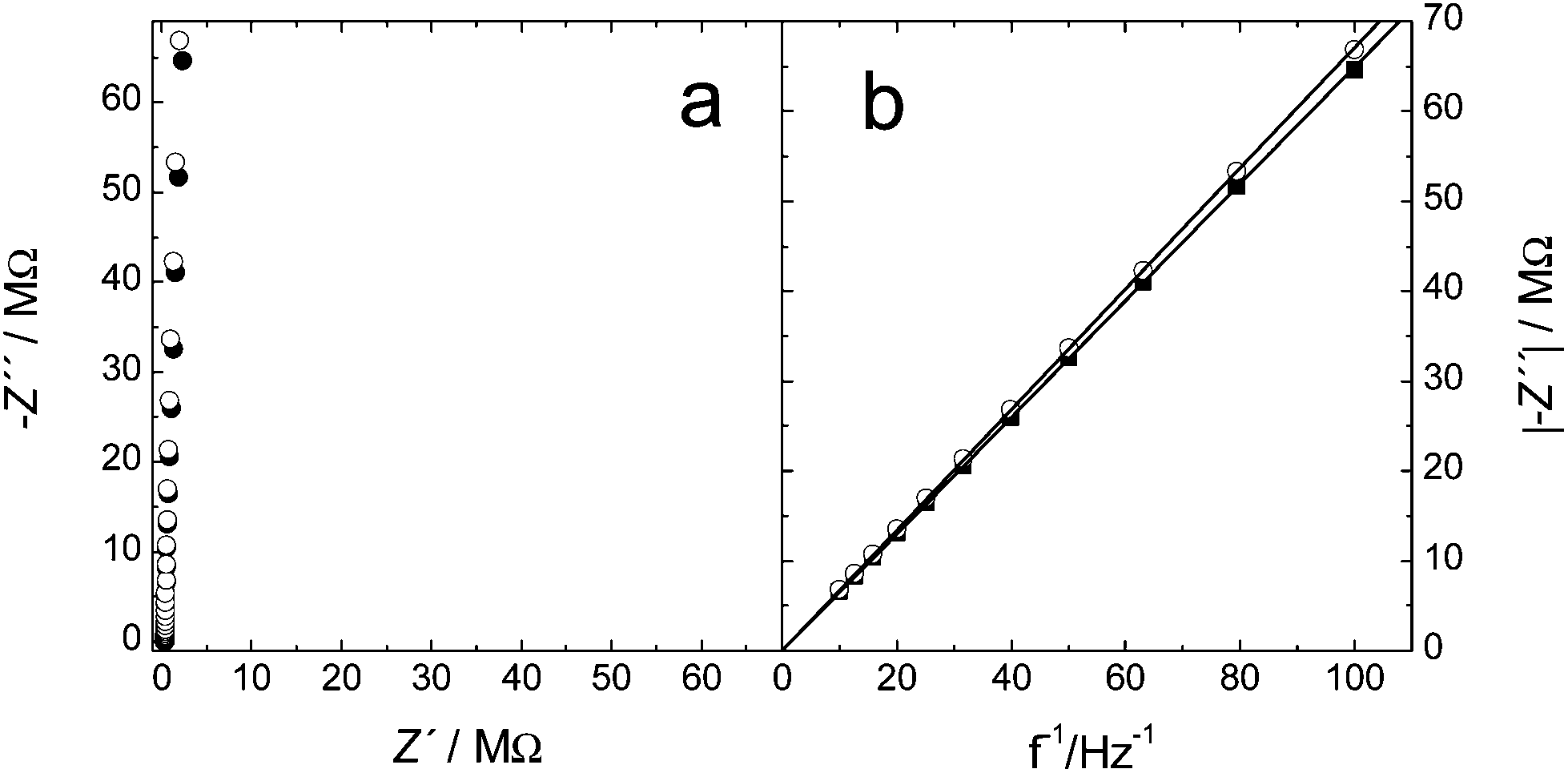 The reason for the capacitor-like behavior is most likely the uniformly porous surface morphology of the PEDOT composite film induced by the wrinkled structure of the high porosity rGO (Fig. 2a–c). In contrast to the relatively smooth surface of the composite films of PEDOT–GO (Fig. 2d) and PEDOT–PSS (Fig. 2e), the surface of the PEDOT composite film electrochemically polymerized in the presence of rGO has an open morphology with the grain size of ca. 200–800 nm (Fig. 2b and c). The open structure makes it easier for charge compensating counter ions to diffuse to the film surface and into the bulk of the composite film which improves the charging/discharging properties of the composite film. The capacitor-like behavior of the PEDOT composite film was further confirmed by the electrochemical impedance spectroscopic (EIS) measurement at 0.25 V. In Fig. 3a, the almost vertical shape of the impedance spectra obtained at low frequencies (10–100 mHz) indicate that the composite films have nearly a pure capacitive behavior. The line fitting28 in Fig. 3b show that the PEDOT composite film measured at 0.25 V had the areal redox capacitance of 12.2 mF cm−2 (r2 = 0.9999) which is in rather good accordance with the areal redox capacitance of PEDOT–GO films electropolymerized at 0.94 V (14.3 mF cm−2) and 0.97 V (14.7 mF cm−2), but considerably higher than for PEDOT–GO prepared at 1.05 V (5.3 mF cm−2).29