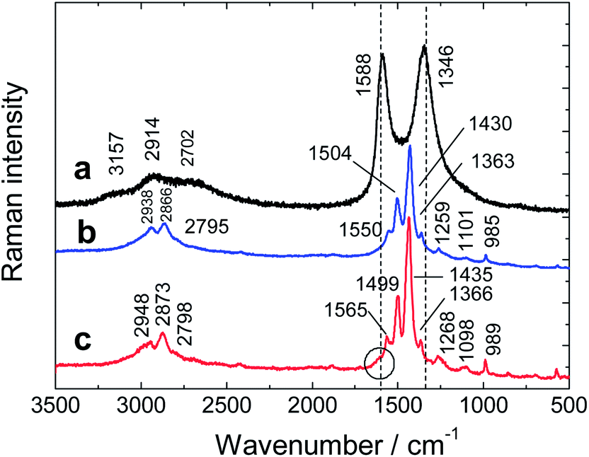 | Fig. 4 The Raman spectra of (a) the rGO powder, (b) the PEDOT–PSS and (c) the PEDOT composite films. Laser excitation wavelength: 514 nm. | ||