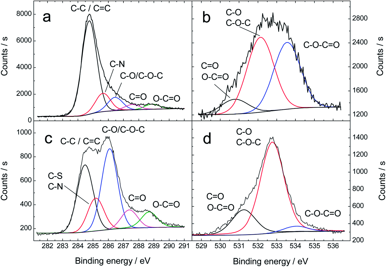 To gain a deeper understanding of the PEDOT composite material, we measured the XPS spectra of rGO and the composite film (Fig. 5). Except of the C–C/C![[double bond, length as m-dash]](https://www.rsc.org/images/entities/char_e001.gif) C band at 284.8 eV,6,9,35 the C 1s spectra of rGO revealed that it contained low amounts of hydroxyl and epoxy (286.5 eV),9,35 carbonyl (287.6 eV)6,9,35 and carboxyl (288.9 eV)6,35 groups (Fig. 5a). The XPS fitting gave the following atomic composition of rGO: 83.4% carbon, 12.8% oxygen, 3.6% nitrogen and 0.2% sulfur which gives a C