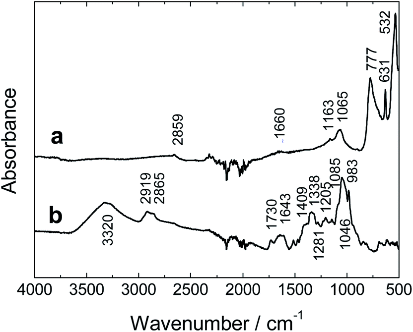 The FTIR spectra of rGO in Fig. 6 (spectrum a) is almost featureless except of the bands related to the absorption of crystal water at 532 cm−1 and 631 cm−1, and the vibrational bands at 777, 1065 and 1163 cm−1 bands originating from the carbon-hydroxo complexes of rGO and coordinated water.38 This is in good accordance with the XPS spectrum of rGO in Fig. 5a and b confirming the low amount of hydroxyl, epoxy, carbonyl and carboxylic groups in rGO. In Fig. 6 (spectrum b), the FTIR spectrum of the PEDOT composite shows bands originating from OH stretching and absorbed water (3320 cm−1), –C![[double bond, length as m-dash]](https://www.rsc.org/images/entities/char_e001.gif) O stretching of carboxylic and carbonyl groups (1730 cm−1),39,40 C–OH deformation (1409 cm−1), C–O–C (1205 cm−1) and C–O groups (1046 cm−1).41,42 The rather broad band at 1643 cm−1 is most likely related to skeletal vibrations of graphitic (sp2) domains or bending vibrations of water molecules.38,41 The main IR bands of PEDOT are usually located below 1550 cm−1 and are so called doping induced bands (983, 1085, 1281, 1338 cm−1).43–45 A more thorough discussion of the FTIR bands of PEDOT–GO is given in ref. 25. It can be concluded from the FTIR spectrum b in Fig. 6 that the electropolymerization process results in formation of PEDOT and the bands at 1046, 1409 and 3320 cm−1 indicate that OH groups are formed on the re-oxidized rGO surface. Moreover, the band at 1730 cm−1 assigned to carboxyl and carbonyl stretching may indicate a certain degree of overoxidation of the PEDOT matrix.