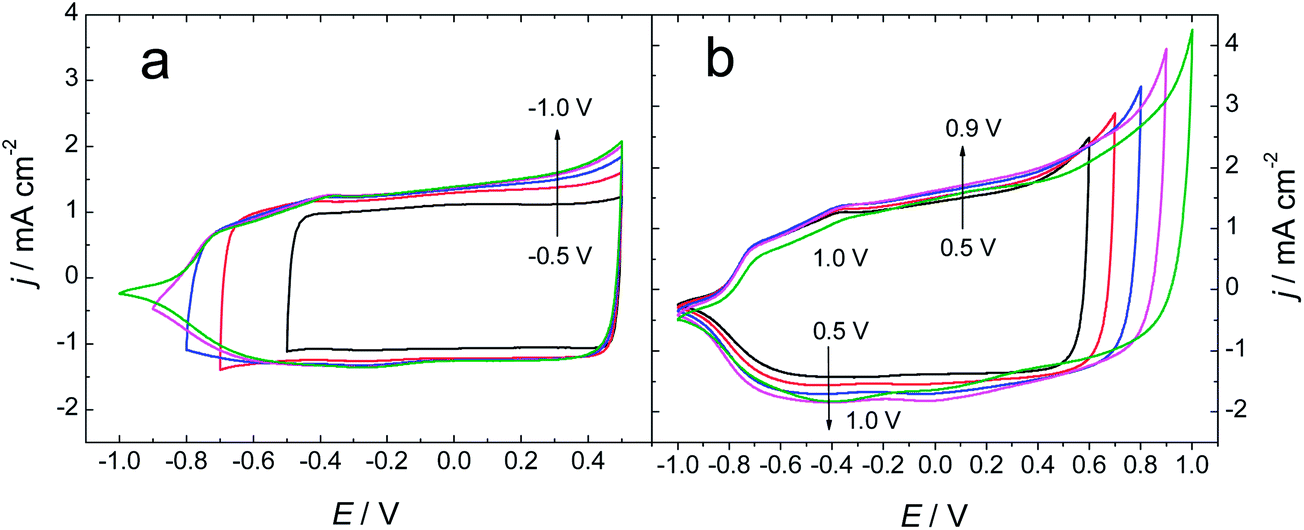 Composite materials of electrically conducting polymers (ECP) and graphene or rGO have a synergetic effect which improves, for example, the capacitance of the composite materials compared to the ECPs and graphene or rGO alone.13 In the ECP–graphene and ECP–rGO composites, the graphene and rGO which are electrical double layer capacitors add mechanical strength to the ECP matrix and increase its electrical conductivity while the ECPs are redox capacitors (pseudocapacitors) improving the relatively low capacitance of graphene and rGO. This synergetic effect was reflected in the high capacitance of 1126 F g−1 obtained for the PANI–rGO composite,14 in comparison to the much lower capacitance of the graphene ultracapacitors, 135 F g−1,15 and polyaniline (PANI) with a nanowire structure, 724 F g−1.16 It was also recently shown that the electrochemical reduction of PANI–GO to PANI–rGO improved the electroactivity with 30% and increased the areal capacitance with 15% from 67 mF cm−2 to 77 mF cm−2.13 Moreover, the PANI–GO composite film had an outstanding potential cycling stability in 0.1 M KCl for 10![[thin space (1/6-em)]](https://www.rsc.org/images/entities/char_2009.gif) 000 cycles between −0.5 to 0.5 V with no degradation of the anodic charge showing the beneficial effect of incorporating GO in the ECP matrix.