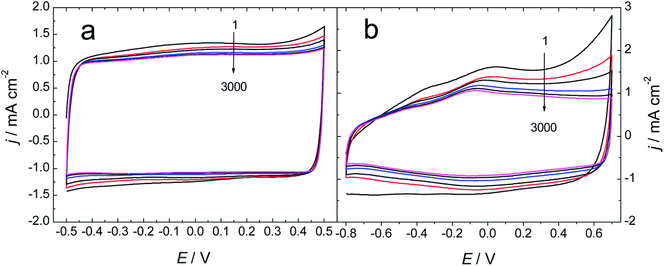 The results of the potential cycling stability tests are presented in Fig. 8a and b. As shown in Fig. 8a, the potential cycling stability of the PEDOT composite film is very good for at least 3000 cycles between −0.5–0.5 V in 0.1 M KCl with only 12.4% decrease of the areal capacitance from 12.1 mF cm−2 to 10.6 mF cm−2 (Fig. 9). The stability against degradation was even better between 200–3000th cycles (capacitance decrease: 7.8%), if the initial conditioning and structural re-orientation effects of the composite film are neglected during the first 200 potential cycles. After the stability test, the film relaxation was allowed to take place at the open circuit potential before recording the EIS spectra at 0.25 V. The obtained areal capacitance of 11.8 mF cm−2 (3.3% decrease of its initial value; r2 = 1) further confirmed the good stability against degradation of the PEDOT composite film (Fig. 3). It must be stressed that the CV of the PEDOT composite film in Fig. 8a shows almost a rectangular shape characteristic of ideal capacitors. Most likely the re-oxidized rGO surface can act as charge compensating counter ions during the oxidation and reduction process of the composite film which decreases the diffusion pathway of the counter ions to the PEDOT matrix, thus ensuring a quick charging/discharging of the material. This effect is probably enhanced by the fully open film structure facilitating the diffusion of the chloride ions from the electrolyte solution into the entire bulk of the polymer matrix.