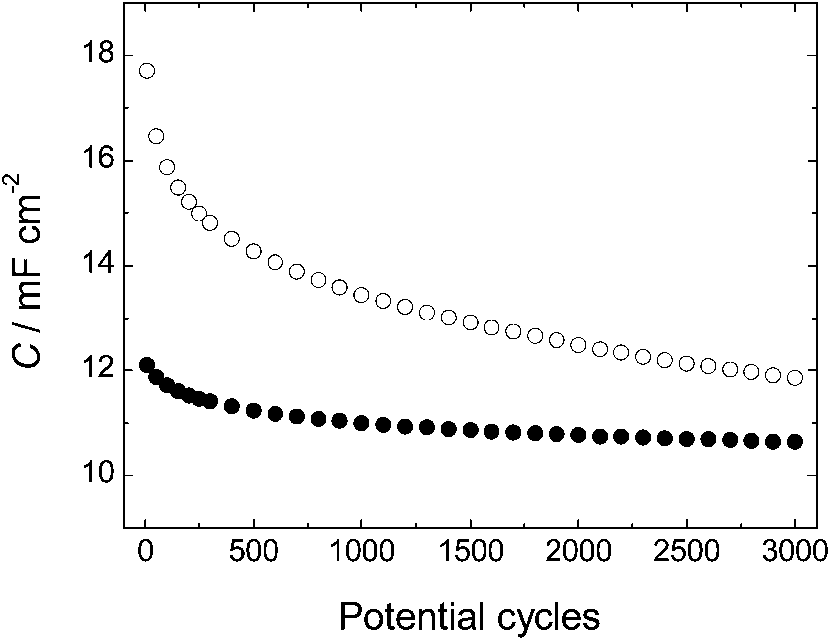 | Fig. 9 The areal capacitance vs. the number of potential cycles for the PEDOT composite film recorded during the potential cycling stability test shown in Fig. 8. Potential interval: (●) −0.5 V to 0.5 V, (○) −0.8 V to 0.7 V. | ||