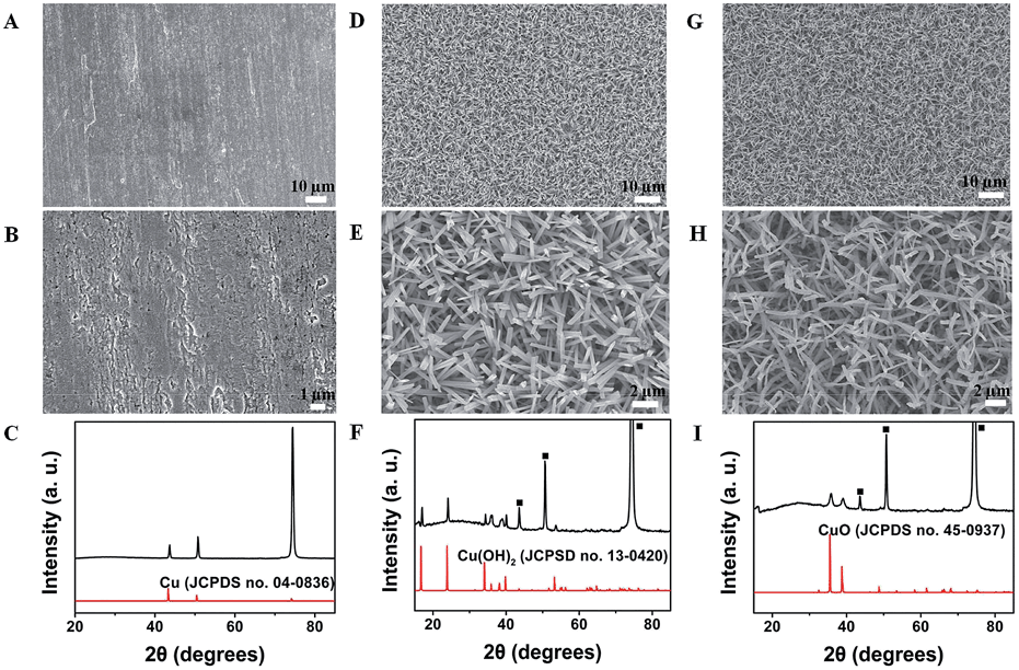 | | Fig. 1 SEM images and XRD patterns of Cu electrode (A–C), Cu(OH)2 NWs (D–F), and CuO NWs (G–I). Peaks marked with ■ are from the copper foil. | |