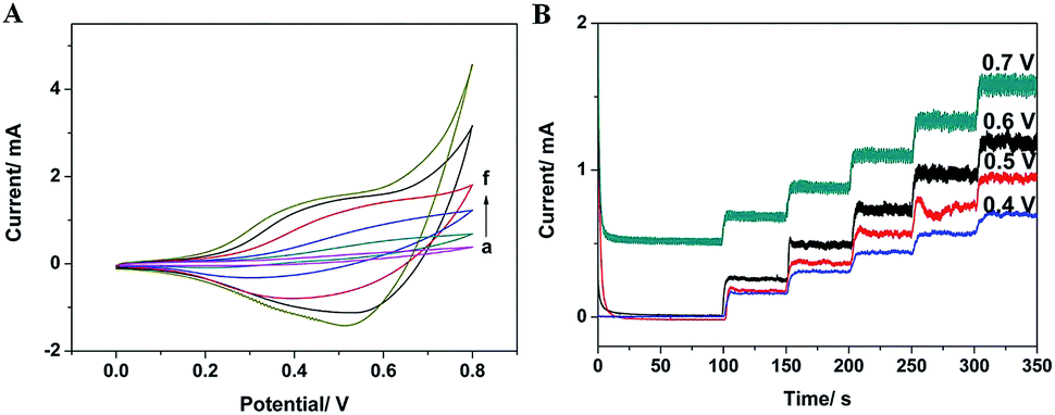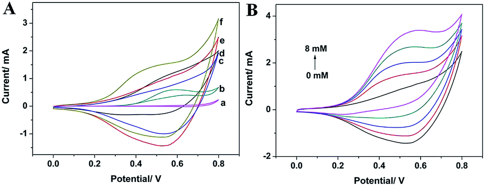| | Fig. 2 (A) CVs of Cu electrode (a and b), Cu(OH)2 NWs modified Cu electrode (c and d), CuO NWs modified Cu electrode (d and e) in 0.1 M NaOH in the absence (a, c and e) and presence of 2 mM glucose (b, d and f) at the scan rate of 50 mV s−1. (B) CVs of the CuO NWs modified Cu electrode in the absence and presence of glucose with different concentrations (from the bottom to top: 0, 2, 4, 6, 8 mM). Scan rate: 50 mV s−1. | |