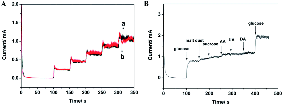 The selectivity of the CuO NWs modified Cu electrode was also investigated because the co-existing electroactive species might affect the detection of glucose in real sample analysis. UA, DA and AA are the major interferences normally co-existing with glucose in real samples. Moreover, other carbohydrate compounds may also affect the determination of glucose. Considering that the normal physiological level of glucose is about 30 times than that of the interfering agents,42–44 the anti-interference effect of the as-prepared CuO NWs modified electrode was tested by successive addition of 1 mM glucose, and 0.2 mM of each of five relevant interfering species including sucrose, malt dust, AA, UA and DA. Fig. 5B shows that no obvious interference is observed, suggesting the sensor exhibits high selectivity to the detection of glucose.