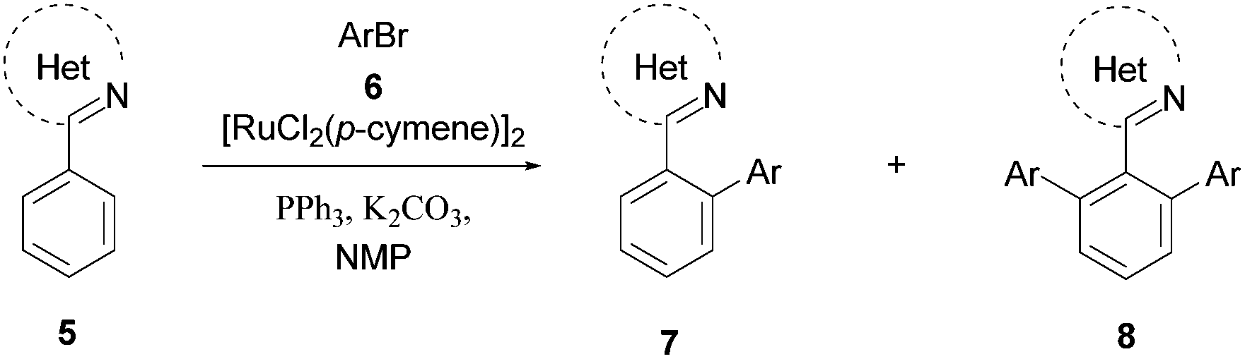 Scope of the reaction was tested employing various arenes 5 as the substrate (Table 2). The reaction was conducted in the presence of 2.2 equiv. of ArBr 6 and 0.5 mol% of [RuCl2(p-cymene)]2. The C–H arylation took place smoothly for 2-phenylpyridine to give arylated product 7 and 8 in good yields though the monoarylation selectivity was poor (Table 2, Entries 1–4). The reaction of 1-phenylpyrazole and 2-phenyloxazoline smoothly provided corresponding arylated products as well (Table 2, Entries 5–10). When 1-benzyl-5-phenyl-1H-tetarazole was reacted with 4-brormotoluene or 4-bromobenzyl benzoate, the reaction proceeded well to give the monoarylation product selectively (Table 2, Entries 11 and 12). Although the monoarylation selectivity was not achieved in the reactions except 1-benzyl-5-phenyl-1H-tetarazole as the substrate, fairly good yields were obtained in the presence of quite low Ru catalyst loading (0.5 mol%).10