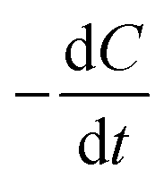During the irradiation period, MB-photo degradation data were analyzed using the Langmuir–Hinshelwood kinetic model:34 with the rate being proportional to the coverage θ which becomes proportional to C at low concentrations:
