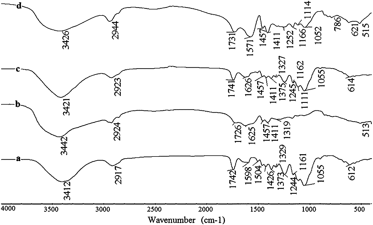 C stretching vibrations of the residual aromatic ring in the PKF.28 The characteristic absorption band at 1055 cm−1 is attributed to the C–O stretching vibration of cellulose, which are obviously weakened after reaction (Fig. 1d). However, it can still be observed in the spectrum of the physical mixture of PKF and PNaA with almost no change in intensity (Fig. 1c). In Fig. 1d, new bands at 1731, 1571, and 1457 cm−1 are related to the stretching vibration of C