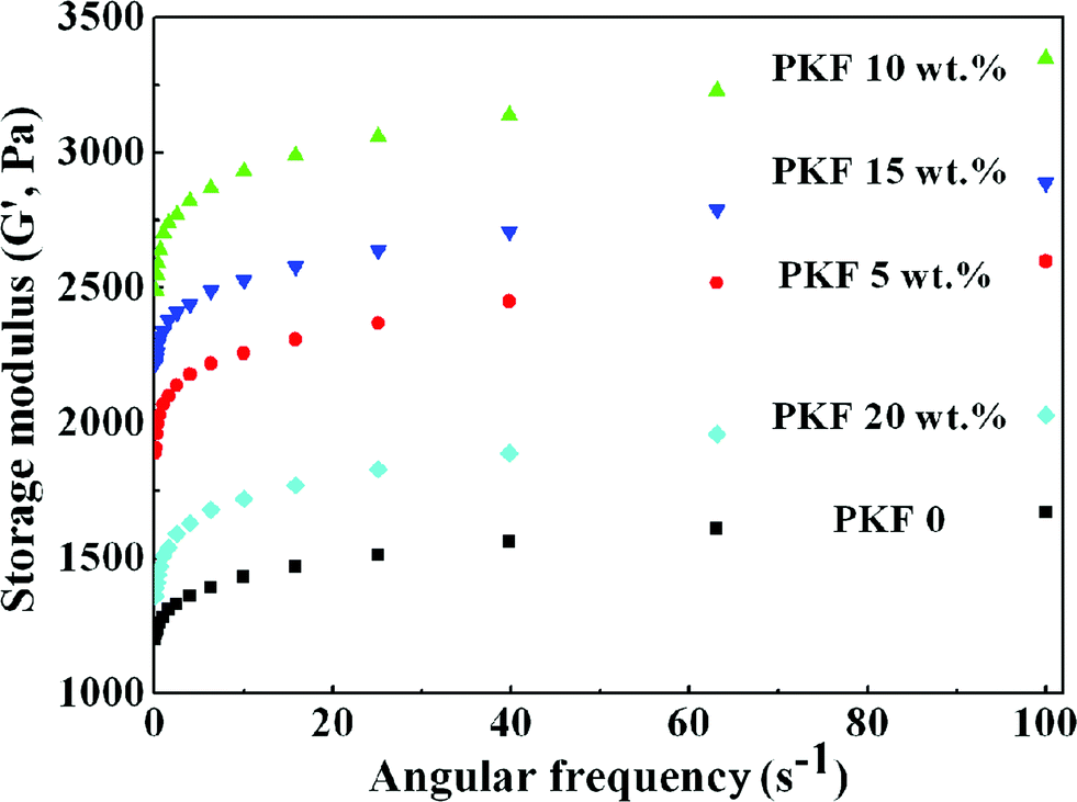 | | Fig. 3 Effect of PKF content on the storage modulus (G′) of the PNaA/PKF superabsorbents. | |