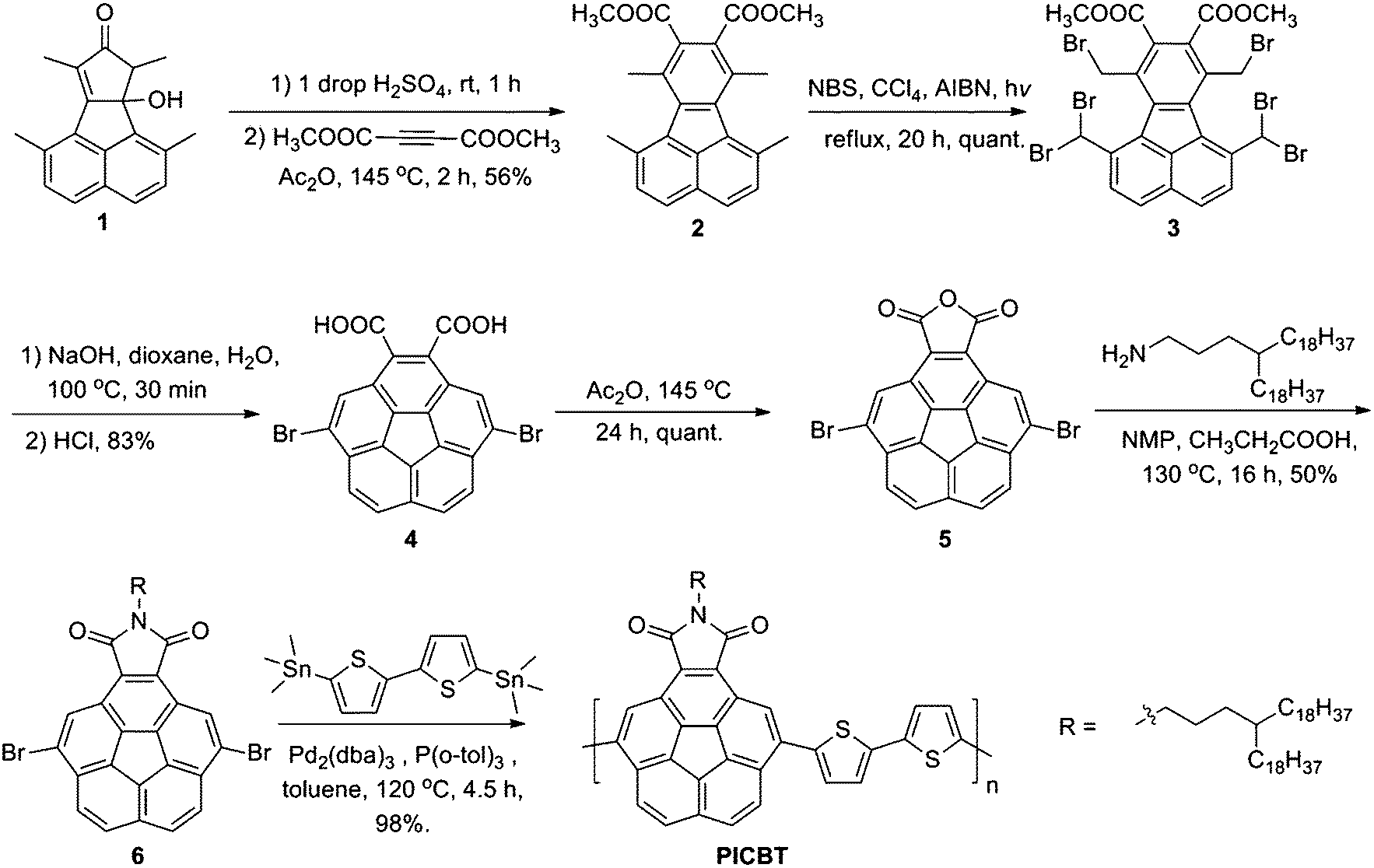 As shown in Scheme 1, the synthesis of polymer PICBT started from compound 1. Compounds 1–4 were synthesized as reported.47,48 Compound 1 was dehydrated in acetic anhydride with one drop of sulfuric acid and subsequent Diels–Alder reaction with dimethyl acetylene dicarboxylate to give compound 2. Radical bromination of compound 2 with AIBN as radical initiator formed compound 3. The ring closure of compound 3 using a dioxane/water mixture in the presence of NaOH provided compound 4. In refluxed Ac2O, dicarboxylic acid 4 was converted to dicarboxylic anhydride 5. Compound 5 was insoluble in common organic solvents and was used without further purification. An amine with long alkyl chain, 4-octadecyldocosan-1-amine reacted with compound 5 to give compound 6, thus ensuring sufficient solubility of the resulting polymer. Compound 6 reacted with 5,5′-bis(trimethylstannyl)-2,2′-bithiophene through Stille reaction to form polymer PICBT. The number average molecular weights of the polymer PICBT was determined as 40.5 kDa with polydispersity index (PDI) of 3.5, by high temperature gel permeation chromatography using polystyrene as standard and 1,2,4-tricholorobenzene as eluent at 150 °C (Fig. S1†). The polymer exhibited great thermal stability with a decomposition temperature at 447 °C (5% loss) (Fig. S2†).