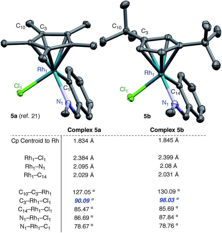 To investigate the steric differences between the RhCp* and RhCpt systems X-ray analysis was conducted on a 5-membered RhCpt metallacycle. While we were unable to obtain a 5-membered rhodacycle from our system, Jones and coworkers previously characterized 5-membered rhodacycle 5a from N-benzylidenemethanamine and [RhCp*Cl2]2.21 We found that a similar metallacycle 5b derived from [RhCptCl2]2 could be obtained in crystalline form under identical conditions and was evaluated by single crystal X-ray diffraction.