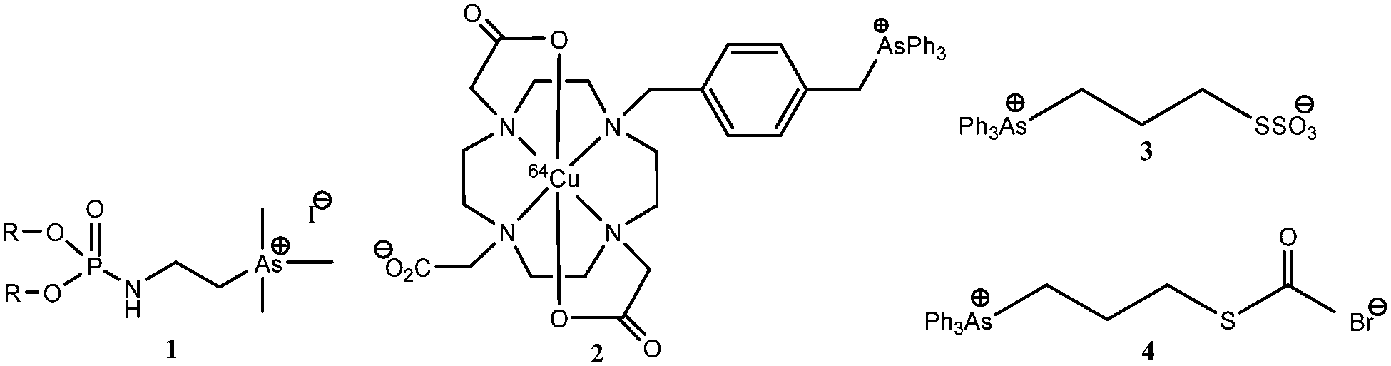 The chemistry of arsenic is broadly similar to that of phosphorus, and organic phosphonium salts are known to act as lipophilic cations that are preferentially accumulated in the mitochondria of cells.7 Similarly, arsonium cations are also lipophilic and lipophosphoramidate derivatives containing arsonium head-groups (1)8 have been studied as gene delivery systems, and 64Cu-labelled complexes of 1,4,7,10-tetraazacyclododecane-4,7,10-triacetic acid-conjugated triphenylarsonium cations (2) have been found to act as tumour-selective PET imaging agents.9 Phosphonium species have been found to be extremely valuable for mitochondria-targeted therapeutics and diagnostics. Mitochondrial dysfunction is associated with a number of disorders and there is increasing awareness of the importance of targeting drugs to this organelle.7 Recent work has demonstrated the potential of combining phosphonium compounds with nanotechnological approaches to traffic pharmaceutical and diagnostic moieties into mitochondria.10 For example, incorporation of phosphonium groups into the lipid bilayer of liposomes,11 or onto the surface of dendrimers12 and polymer nanoparticles,13 facilitates their preferential uptake by mitochondria. We have prepared phosphonium-functionalised gold nanoparticles14–16 which are accumulated by cells and shown by TEM to be localised in the mitochondria.17 Inspired by the success of arsonium systems such as 1 and 2 we decided to broaden the scope of our studies to include triphenylarsonium compounds and herein report our preliminary results on the biological properties of triphenylarsonium alkylthiosulfate zwitterions (3) and salts (4) and their application in the synthesis of triphenylarsonium-functionalised gold nanoparticles (AuNPs).