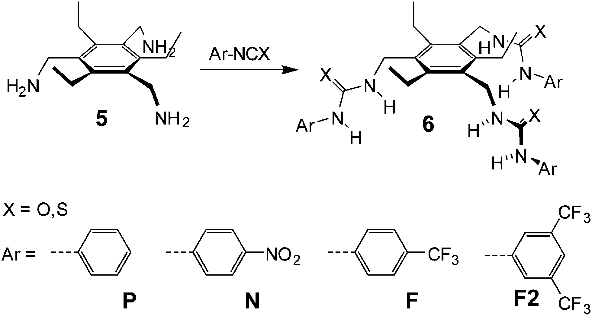 Tris(thio)ureas 6 were synthesised by treatment of 5 with 3.3–4 equivalents of the appropriate isothiocyanate or isocyanate overnight at room temperature in either THF or DMF. Thioureas 6SP, 6SN, 6SF, and 6SF2 were obtained in 54–88% yields, and urea 6OF2 in 32% yield. Detailed synthetic procedures and full characterisation data are given in the ESI.†
