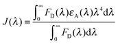 where FD(λ) is the fluorescence intensity of the donor in the wavelength range of λ to λ + dλ and is dimensionless; λA(λ) is the extinction coefficient (in M−1 cm−1) of the acceptor at λ. If λ is in nm, then J is in units of M−1 cm−1 nm4. The estimated value of the overlap integral is 2.50 × 1015. Once the value of R0 is known, the donor–acceptor distance (rDA) can be easily calculated using the formula| |  | (9) |