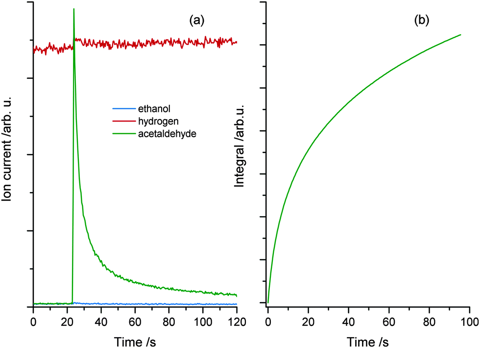 Fig. 3 (a) Isothermal photoreaction at 222 K. Prior to reaction, 1 L ethanol is dosed at a temperature of 120 K. UV excitation starts at 23 seconds and an immediate increase in acetaldehyde production is observed, while the ethanol trace remains unchanged. Note that the slight change in the molecular hydrogen trace is attributed to cracking in the QMS rather than to the production of H2. Part (b) shows the integrated mass signal of figure (a), which shows the same trend as Fig. 2(c). |