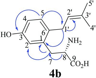 2 in the reaction mixture of FgaPT2 at 10.3 and 11.4 min and only one in that of 7-DMATS at 11.4 min. The UV maxima of 4b at 220 and 283 nm differed slightly from those of 4c at 220 and 278 nm. For structure elucidation, 4b and 4c were isolated on HPLC from the incubation mixture of 4a with FgaPT2 and subjected to NMR (Table 2; Fig. S2–S5 in the ESI†) and HR-MS analyses (Experimental section). HR-MS data confirmed the monoprenylation of the isolated products. Inspection of the 1H-NMR spectra (Table 2) of 4b and 4c revealed the presence of signals for a regular prenyl moiety each at δH 3.33 or 3.24 (d, H-1′), 5.19 or 5.28 (br t H-2′), 1.73 or 1.70 (s H-4′) and 1.72 or 1.69 ppm (s, H-5′). The signals of the aromatic protons at 6.69 (d, 2.5 Hz, H-2), 6.64 (dd, 8.0, 2.5 Hz, H-4), and 7.00 (d, 8.0 Hz, H-5) of 4b and 6.69 (s, H-2), 7.00 (d, 7.5 Hz, H-5), and 6.67 (d, 7.5 Hz, H-6) of 4c indicated the prenylation at C-4 in one case and C-6 in another case. To determine the structures of 4b and 4c, we recorded HSQC and HMBC spectra for 4b (Fig. 3, Fig. S3 and S4 in the ESI†). The important correlation between H-1′ and C-1 prove unequivocally that 4b is the C6-prenylated derivative, i.e. prenylation at the para-position to the phenolic hydroxyl group (Fig. 2Z). Consequently, 4c is the C4-prenylated product (Fig. 2Z). Due to the low quality, the structure of the enzyme product of 4a with 7-DMATS could not be elucidated in this study. However, from its same retention time and UV absorption maxima with those of 4c, it could be speculated that this substance has the same structure as 4c.