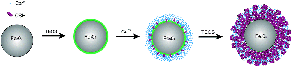 In this paper, we report a strategy to prepare an adsorbent consisting of iron oxide core and mesoporous CSH shell (illustrated in Scheme 1). The Ca2+ cations are rapidly adsorbed onto the Fe3O4@SiO2 surface via electrostatic attraction because the surface of magnetic silica microspheres is full of compact negative charges. In addition, surface modifications of Fe3O4 offer an abundance of surface hydroxyl groups to link Ca2+ cations. The shell of CSH nanoplatelets forms by an in situ growth technique under ultrasonic irradiation. The use of an in situ growth method allows CSH nanoplatelets to become strongly anchored onto the surface of the magnetic core.19 The magnetic characteristics is helpful for the separation. The core–shell structure renders high specific surface areas.20 In addition, its application in the removal of uranium from aqueous systems was investigated. The effects of experimental factors on uranium sorption, as well as relevant adsorption kinetics and thermodynamics, were systematically evaluated. The results demonstrate that CSH has high uranium removal efficiency and can be separated quickly from the treated water.