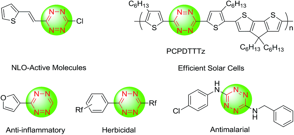 As the good electron acceptors, 1,2,4,5-tetrazine derivatives can be used as 4-π components in inverse-type Diels–Alder reactions,11 and provide an access to many heterocycles12 and natural products.13 Furthermore, 1,2,4,5-tetrazine derivatives exhibit various biological activities such as antibacterial, antiviral and antitumor properties,2,14,15 therefore these compounds can served as pesticides, herbicides and anti-inflammatory, antimalarial drugs (Fig. 1).16–19