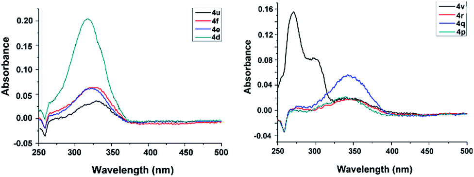 | Fig. 2 UV-vis absorbance spectra of the compounds 4d, 4e, 4f, 4p, 4q, 4r, 4u, and 4v in dichloromethane (c = 1 × 10−6 mol L−1). | ||