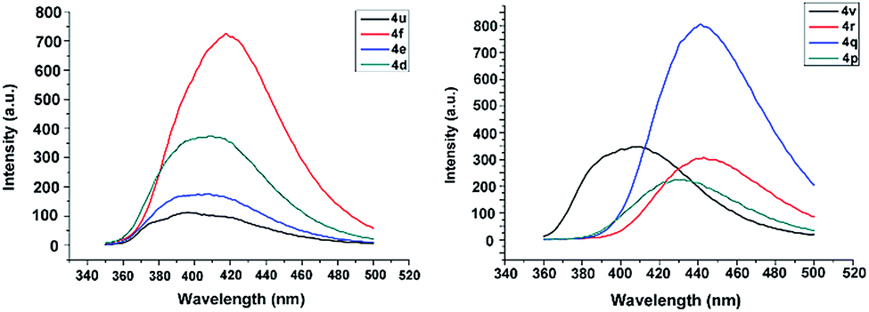| Fig. 3 Fluorescence spectra of the compounds 4d, 4e, 4f, 4p, 4q, 4r, 4u, and 4v in dichloromethane (c = 1 × 10−6 mol L−1). | ||