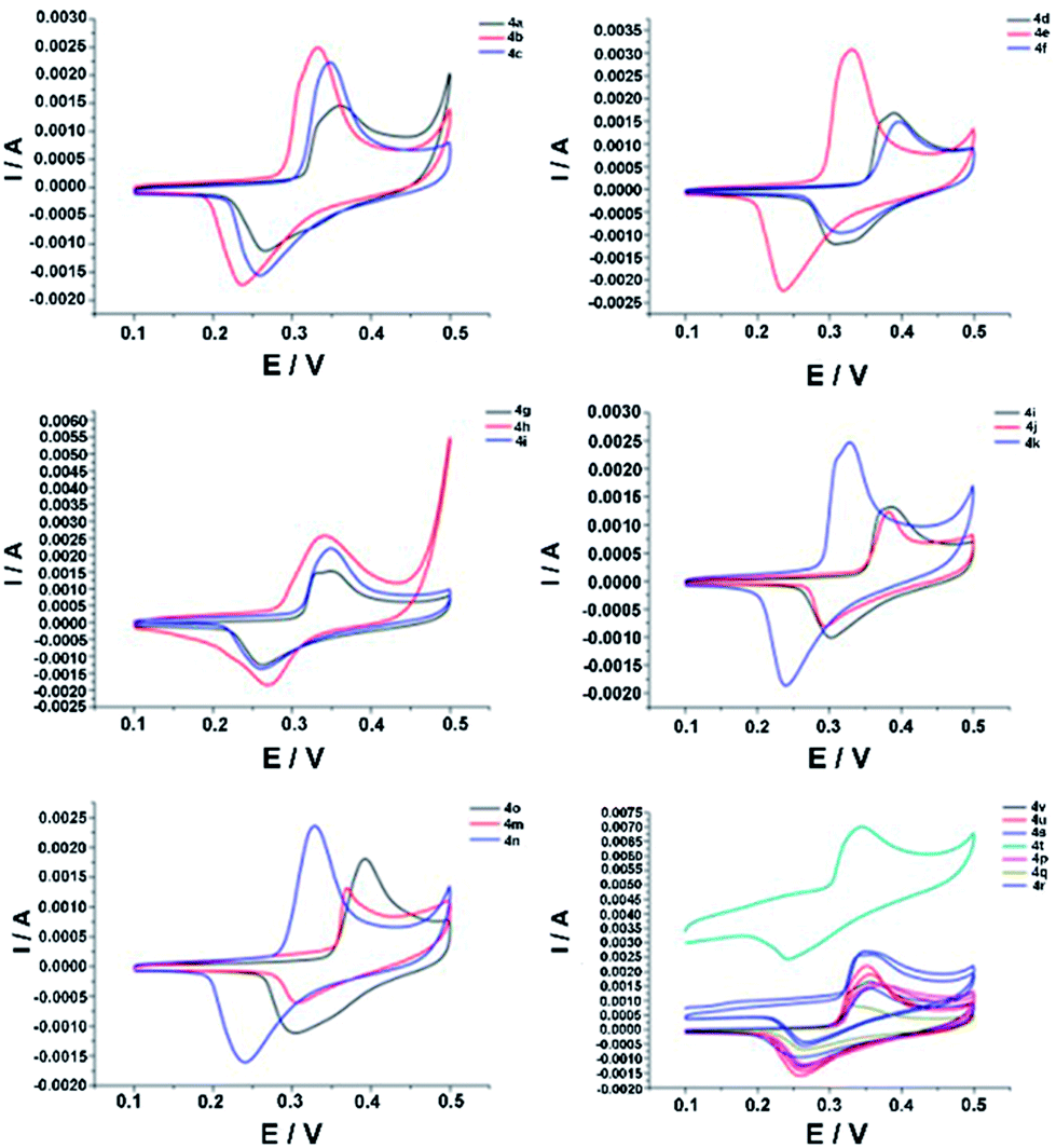 | Fig. 4 Cyclic voltammetry (CV) curves for compounds 4a–v, the obtained samples in 2 M KOH electrolyte versus SCE at scan rate of 20 mV s−1, the voltage window was ranged from 0.0–0.5 V. | ||