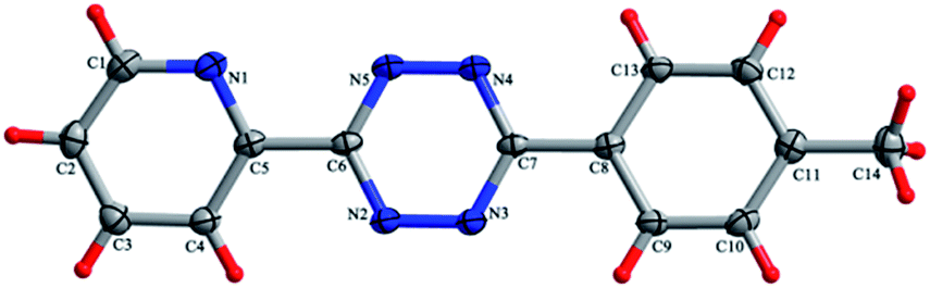 We systematically performed calculations for all the synthesized tetrazine derivatives 4a–v. The geometry optimization of 4a was based on its X-ray crystal structure (Fig. 5), and the others were based on the molecular structures drawn by Chem3D and Gaussview.