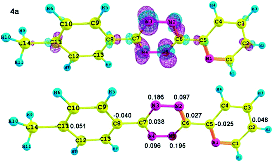 For 4a, the 3D representation of the Fukui function and the condensed Fukui function of atoms are shown in Fig. 6 (4b–v, see in the ESI†). The 3D representation of f(r)+ clearly demonstrates that the region around the N atoms of the 1,2,4,5-tetrazine skeleton possess higher reactivity than other parts. Therefore the 1,2,4,5-tetrazine skeleton as the electron-deficient unit may has the stronger electrophilic ability, and can be used as the 4-π components in the inverse-type Diels–Alder reaction. Furthermore, the f(r)+ calculation results also indicate the regioselectivity in the inverse-type Diels–Alder reaction.