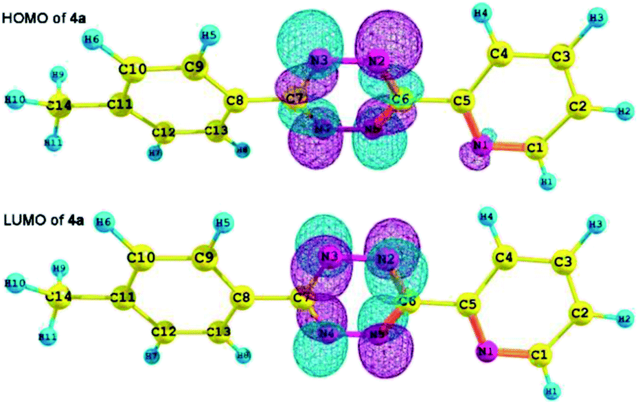 The frontier orbitals HOMO and LUMO for all the synthesized tetrazine derivatives have been also calculated. The 3D representations of HOMO and LUMO orbitals of 4a are shown in Fig. 7 (the shapes of HOMO and LUMO orbitals of 4b–v are shown in the ESI†). The energies of HOMO, LUMO, and the LUMO–HOMO gap for 4a–v are depicted in Table 5.