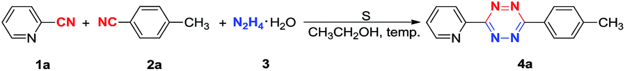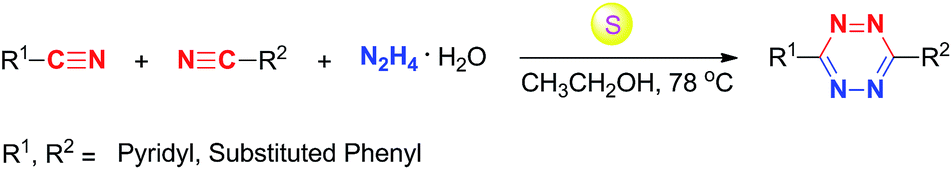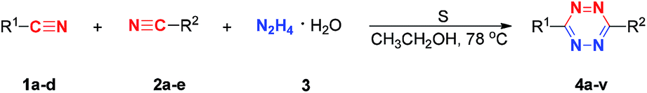 | Scheme 1 Preparation of 3,6-unsymmetrically disubstituted-1,2,4,5-tetrazines from nitriles and hydrazine hydrate. | ||