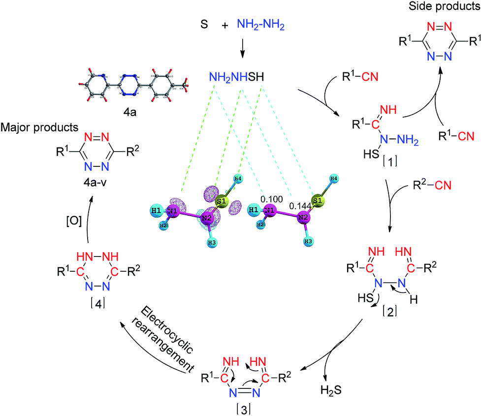 On the basis of the related literature,3a a tentative mechanism for the S-induced reaction between nitriles and hydrazine hydrate, which synthesizes 3,6-unsymmetrically disubstituted-1,2,4,5-tetrazine derivatives via addition–elimination–rearrangement, was proposed in Scheme 2. To inducing the reaction, the S is involved in the reaction process by reacting with hydrazine hydrate to form NH2NHSH.3a The possible structure of NH2NHSH was calculated at DFT level using double-ζ basis set (6-31G** for H element, 6-31+G* for S, N elements). Then, the NH2NHSH interacts with nitrile to produce the key intermediate [1], and this result is supported by the Fukui function f(r)− calculation. The f(r)− calculation result shows that the nitrogen atom connecting with SH of the NH2NHSH should be the first choice for the nitrile electrophilic attack since its value of condensed Fukui function (0.144) is larger than those of other atoms. The 3D representation of Fukui function f(r)− of NH2NHSH and the condensed f(r)− values of N atoms of NH2NHSH are shown in Scheme 2. The intermediate [1] further reacts with the other nitrile to generate [2]. Then, the [2] might be activated by eliminating of hydrogen sulfide to form intermediate [3]. Subsequently, the intermediate [3] converts to the [4] by electrocyclic rearrangement. Finally, the intermediate [4] converts to the target product by air oxidation. In the process of reaction, symmetrical products are also generated, but their yields are very low. The result may be arise from the fact that the concentration of R1-CN is much lower than that of R2-CN after the intermediate [1] is produced. Then [1] more easily reacts with the nitrile with a higher concentration to form the unsymmetrical product. Thus the yield of the unsymmetrical product is much higher than that of the symmetrical product. Moreover, with a kind of nitrile as the substrate, the major product is the symmetrical tetrazines.
