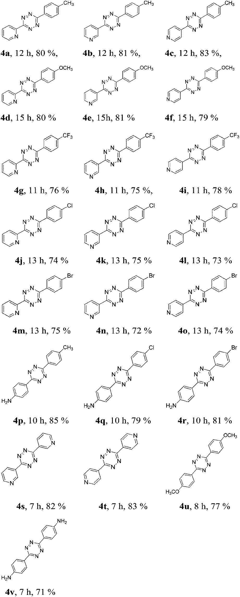The 1,2,4,5-tetrazine ring system, which consists of an electron-deficient aromatic heterocycle with four nitrogens, is known for its high colour, biological activity and electrical property. And this system can be applied to biocompatible labelling agents,4 sensors,5 on/off fluorescence switching,6 live cell imaging,7 and components in photovoltaic cells.8 Additionally, the 1,2,4,5-tetrazines typically have high positive enthalpies of formation and high densities, which are suitable for the development of energetic materials with desirable properties, such as explosive, propellant and pyrotechnics.9,10