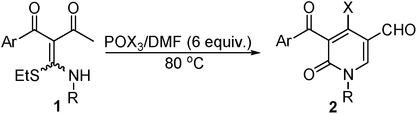 With α-acetyl-α-aroyl ketene-N,S-acetals 1 in hand, we started our investigation on Vilsmeier cyclization of compound 1 resulting in the formation of halogenated pyridin-2(1H)-ones. The reaction of 1a with Vilsmeier reagent POCl3/DMF was selected as model reaction to screen the experimental conditions. It was found that 1a reacted with Vilsmeier reagent POCl3/DMF (4 equiv.) below 70 °C to afford an unstable major product at room temperature (Table 2, entry 1–3). To our delight, when the reaction was carried out at 80 °C for 12 h, a stable white solid product was obtained in 35% yield. From the spectral and analytical data, the product was characterized as desirable product 4-chloro-5-(4-benzoyl)-6-oxo-1-phenyl-1,6-dihydropyridine-3-methylcarbaldehyde 2a (Table 2, entry 4). Additionally, the yield of 2a was not markedly improved by either prolonging reaction time or further elevating reaction temperature (Table 2, entry 5 and 6). However, the reaction showed dependence on the amount of Vilsmeier reagent POCl3/DMF (Table 2, entry 7–9), becoming more efficient with an increased load of this reagent. Consequently, 2a was obtained in 85% yield when 1a reacted with 6.0 equiv. of Vilsmeier reagent at 80 °C for 4 h (Table 2, entry 8). Accordingly, the optimal reaction conditions are 6.0 equiv. of Vilsmeier reagent and a temperature of 80 °C.
