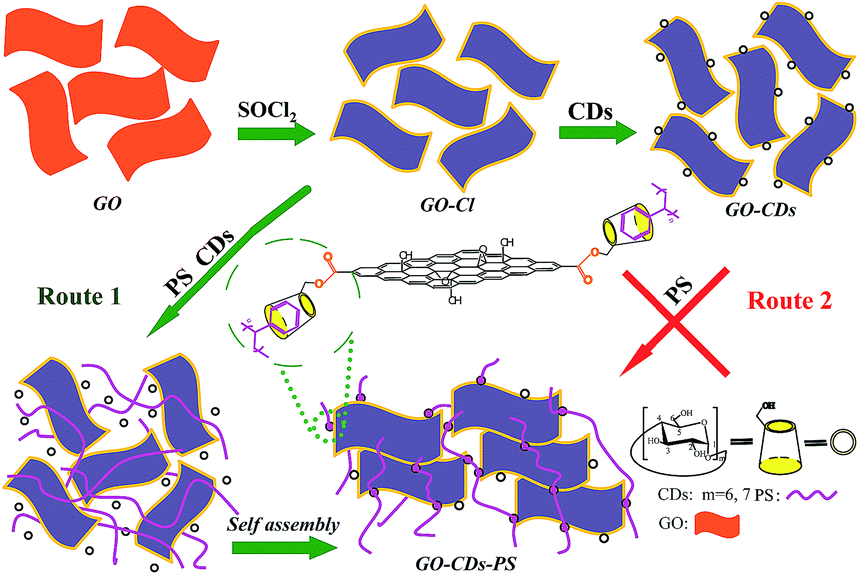 Herein, we report a rational approach for the edge-connected graphene-based frameworks by covalent/noncovalent one-pot strategy, in which the multi-layers graphene-based network is composed of multiple graphene oxide nanosheets utilizing polystyrene (PS) and cyclodextrins (CDs) as hinges. CDs are cyclic oligosaccharides composed of α(1-4)-linked D-glucopyranose units featuring a hydrophobic central cavity suitable for the stable inclusion with various organic molecules.27 In CDs, the reactive activity of primary hydroxyl groups at 6-positions is the highest.19 Furthermore, with a flexible PS as “friendly” and “soft” linkers among graphene sheets, thus the obtained PS-functionalized graphene nanocomposites could acquire better performance and suppleness as desirable for extensive applications. The fabrication process of GO–CDs–PS is illustrated in Scheme 1. To achieve the goal, two synthetic routes might be chosen. One is the conventional process (Scheme 1, Route 2), which would be step by step divided into three tortuous phases including (1) activation of GO,28 (2) CDs modified GO19 and (3) PS functionalized GO. Conversely, the other is timesaving one. After PS and CDs were simultaneously added into the activated GO solution, the final products could be obtained directly by stirring. The process was called as one-pot reaction (Scheme 1, Route 1) (the detailed experimental procedure could be found in ESI†).