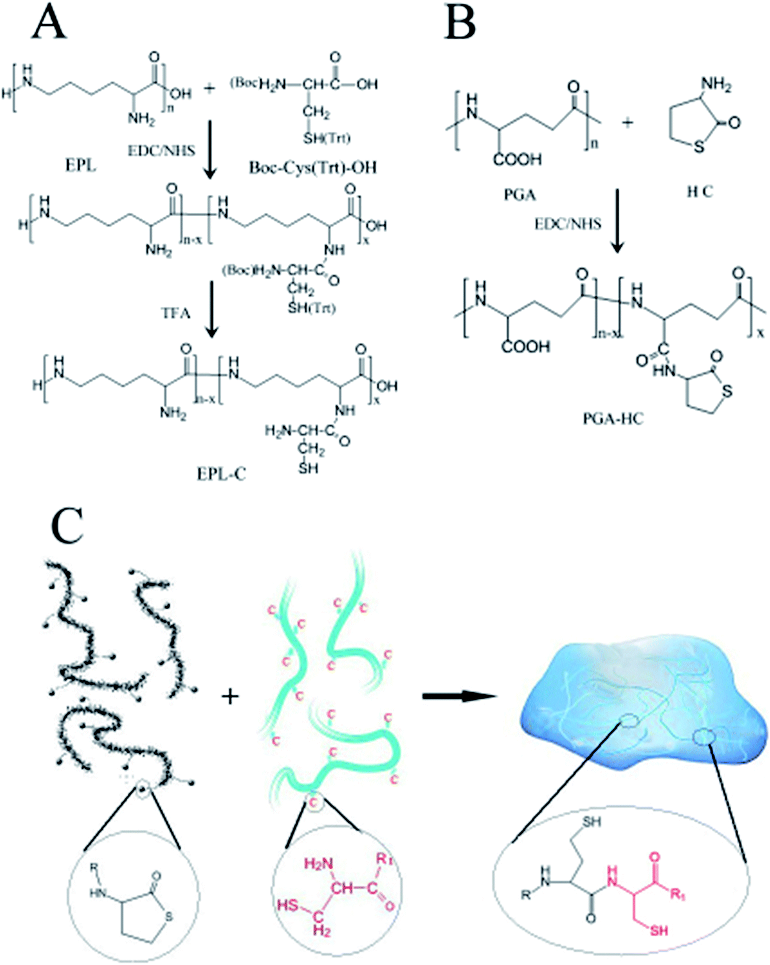 | | Scheme 1 Syntheses of (A) EPL-cysteine precursor; and (B) PGA-thiolactone precursor; (C) the mechanism of NCL hydrogel formation. | |