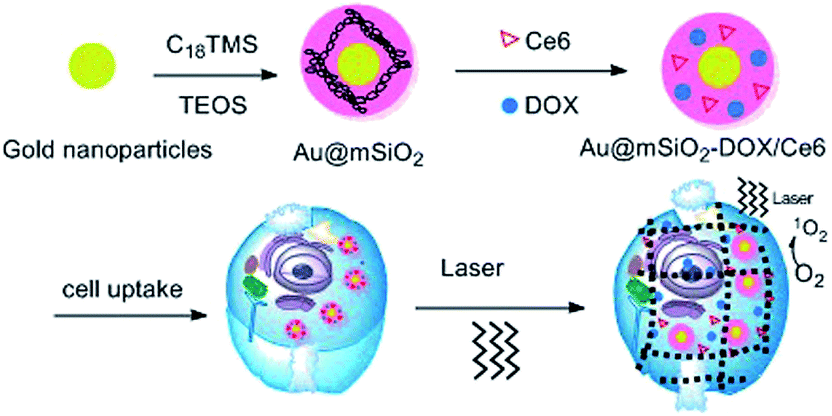 | Scheme 1 Schematic illustration of Au@mSiO2 nanocarrier preparation and application in combined chemo-photodynamic treatment against tumor cells. | |