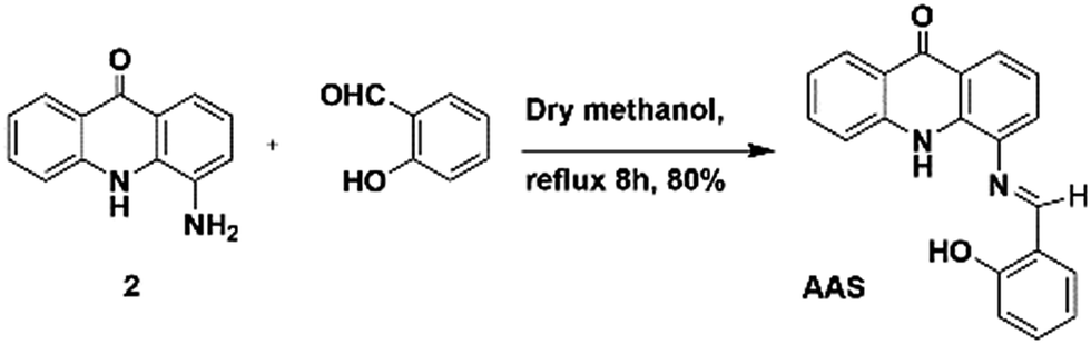 Scheme 1 presents the synthetic protocol of AAS. 4-Amino acridone, the signalling unit is synthesized following our published procedure.27 The acridone based ligand AAS can be synthesised by the Schiff's base formation between 4-amino acridone (2) with salicylaldehyde.
