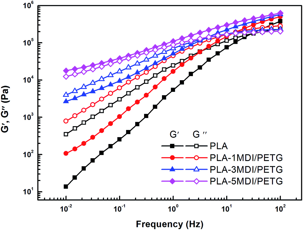 | | Fig. 1 Storage modulus and loss modulus (G′ and G′′) of neat PLA and PLA-MDI/PETG blends. | |