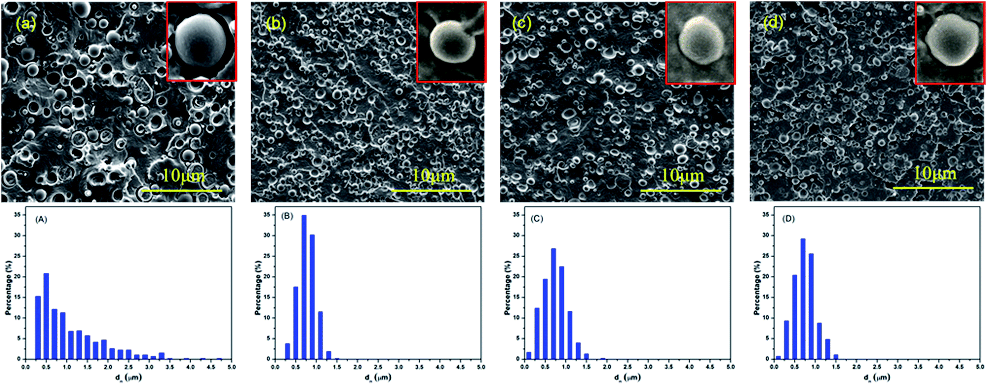 | | Fig. 7 SEM micrographs of cryo-fractured surfaces and the corresponding dn distributions of the blends: (a, A) PLA/PETG, (b, B) PLA-1MDI/PETG, (c, C) PLA-3MDI/PETG and (d, D) PLA-5MDI/PETG. | |
