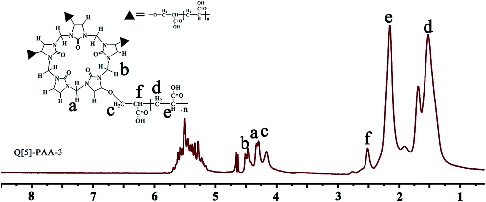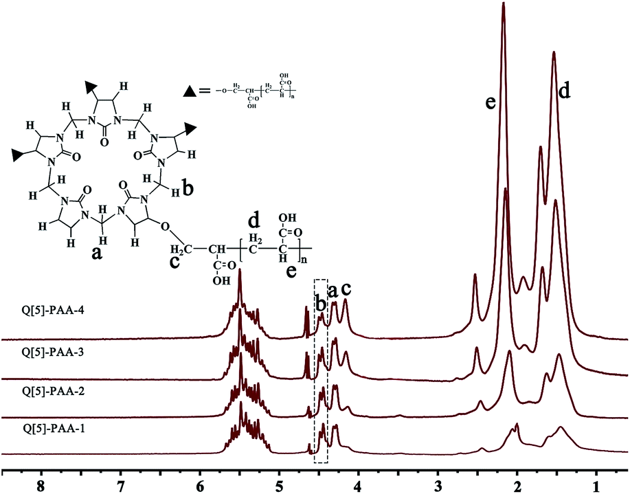 The feed mass of AA is an important influence on the properties of Q[5]-PAA polymers. Fig. 3 shows the 1H NMR spectra of the Q[5]-PAA polymers (Fig. 3). The average molar ratios of PAA to Q[5] (PAA/Q[5]) and the average molar ratios of grafted glycoluril units to the total number of glycoluril units of Q[5] (average grafting degree of Q[5]) can be obtained from the integral intensities of the corresponding proton resonances in the 1H NMR spectra and are listed in Table 1. The average grafting degree decreases with increasing of feed mass of AA, whereas the PAA/Q[5] ratio and the Mw increase with increasing feed mass of AA.