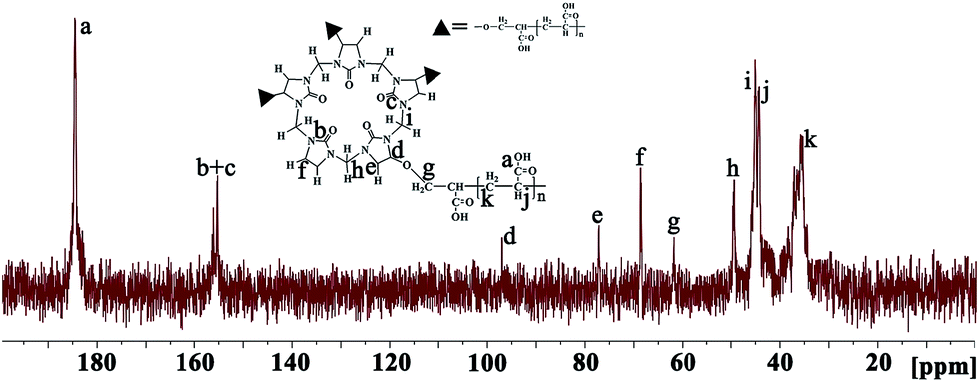 Fig. 1 shows the 1H NMR spectrum of the obtained Q[5]-PAA-3 polymer in D2O as a typical example. Relatively broad proton signals between 1.2–1.8 and 1.8–2.4 ppm are attributed to methylene protons (d) and methine protons (e) of the PAA segment, respectively (see the inset in Fig. 1). The proton signals at ∼2.5 and ∼4.2 ppm can be ascribed to protons (f) and methine protons (c) of the PAA moiety that bridges Q[5] moieties and the PAA segment, which can be confirmed by the gCOSY spectrum shown in Fig. S1 of the ESI.† The signal at ∼4.3 ppm can be assigned to the methylene protons of ungrafted units (Fig. 1a), and the singlets at ∼4.4 ppm can be assigned to the methylene protons of grafted units (Fig. 1b).23,24 The 13C NMR spectrum in Fig. 2 shows a carbonyl carbon signal (a) from carboxyl groups at ∼185 ppm, and resonances (b and c) of two different carbonyl carbons from grafted (b) and ungrafted (c) glycoluril units at ∼157 and ∼156 ppm, respectively. The HMQC NMR spectrum of Q[5]-PAA-3 polymer (Fig. S2 in the ESI†) can assist in fully assigning the carbon signals in Fig. 2: 97.4 ppm for (d), 77.5 ppm (e), 69.1 ppm (f) attributed to three waist carbons of Q[5]. Moreover, the cross peaks at 4.27/49.7 and 4.44/45.4 ppm can be assigned to methylenes close to ungrafted and grafted units, respectively. The cross peaks at 4.12/62.2 and 2.47/34.8 ppm (overlapped) correspond to the bridged AA moiety. The cross peaks at lower fields can be assigned to the PAA segment of the polymer.