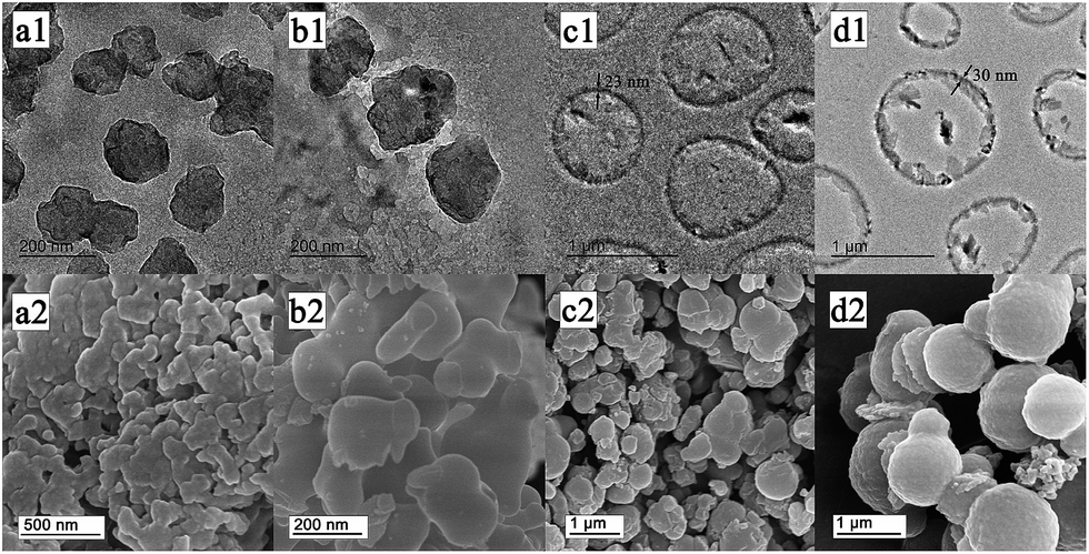 | Fig. 4 Aggregate morphologies of Q[5]-PAA-1 (a1, TEM; a2, SEM), Q[5]-PAA-2 (b1, TEM; b2, SEM), Q[5]-PAA-3 (c1, TEM; c2, SEM), Q[5]-PAA-4 (d1, TEM; d2, SEM). | |