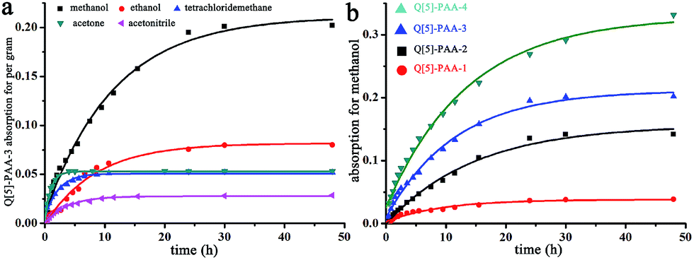 | Fig. 6 (a) Volatile solvent sorption profiles of the Q[5]-PAA-3 porous membrane for methanol, ethanol, acetone, tetrachloride methane, and acetonitrile. (b) Methanol sorption profiles for all Q[5]-PAA samples. | |
