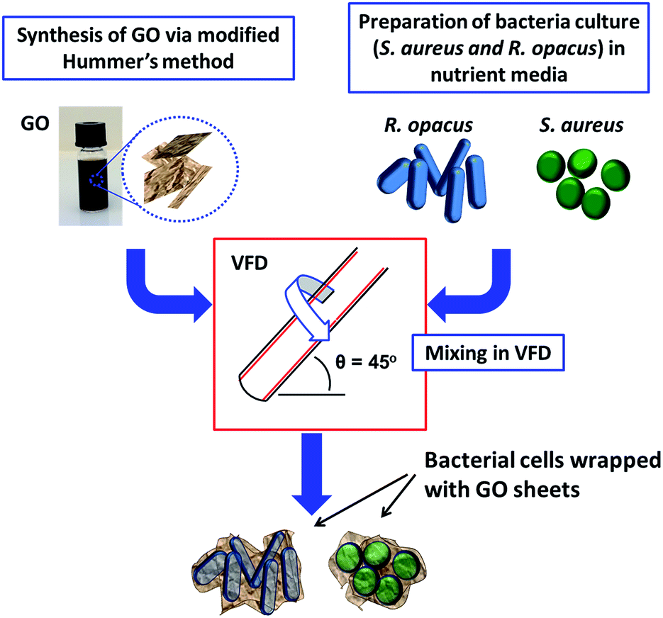Although substantial efforts have been made to interface biological cells with various functional nanomaterials, the preparation techniques are limited and require further development.23 A facile, efficient and environmentally friendly technique is a prerequisite in developing industrial applications.23 Herein we develop the use of a vortex fluidic device (VFD) to effectively interface graphene oxide (GO) sheets to the surface of two different strains of bacterial cells, Staphylococcus aureus and Rhodococcus opacus, in order to impart novel function to the cells in the hybrid materials. Related to this work is the use of the VFD to prepare functional multi-layer graphene–algae and graphene oxide (GO)–algae hybrid materials.10,16 In the VFD, a rapidly rotating tube generates a thin microfluidic film with rapid micro-mixing of reagents therein, and the mechanoenergy in the film is effective in increasing reaction rates, and therefore reducing the processing times.33 Importantly, the VFD can be operated in the confined mode and also continuous flow mode, and it has a diversity of processing capabilities, including in organic synthesis,33–37 controlled growth of the polymorphs of calcium carbonate,38 formation of mesoporous silica at room temperature with control over the pore size,39 compacting single walled carbon nanotube into toroidal structures,40 exfoliation of graphene and boron nitride,41 controlled decoration of nanoparticles on 2D nanomaterials,42–44 preparation of functional hybrid bio-nanomaterials,10,16,45 and the refolding of proteins.46