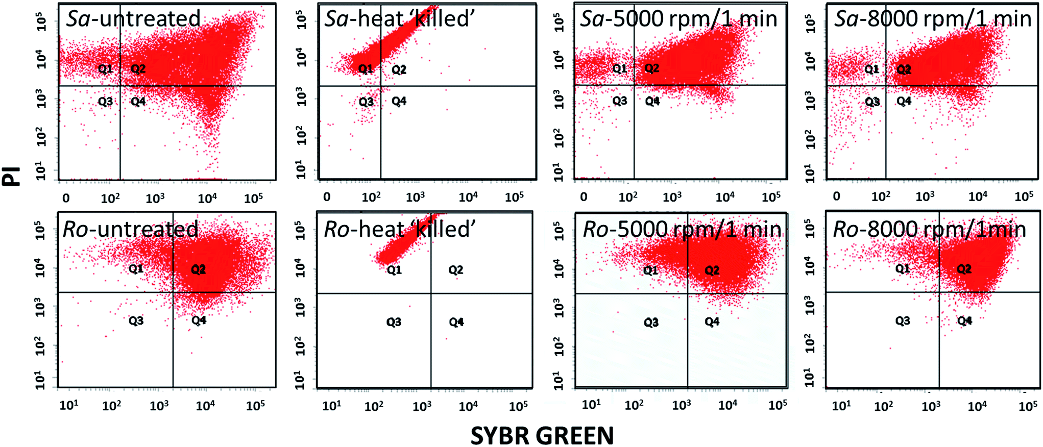 Selection of the bacterial strains for this study was based on the disparate physical structures of spherical S. aureus and rod shaped R. opacus cells. Exploring different cellular morphologies can be useful to understand the effects of shearing forces generated within the microfluidic film in the VFD, towards the bacteria, and subsequently towards the GO in inducing the wrapping process. While S. aureus is easy to grow and could represent a model to study the VFD wrapping efficiency and the effects of shear on bacteria, R. opacus has the advantage of being able to degrade pollutants.47 Since wrapping with GO also has the advantage of water treatment,48 its hybrid with bacterial cells like R. opacus is attractive in developing more efficient waste treatment systems.
