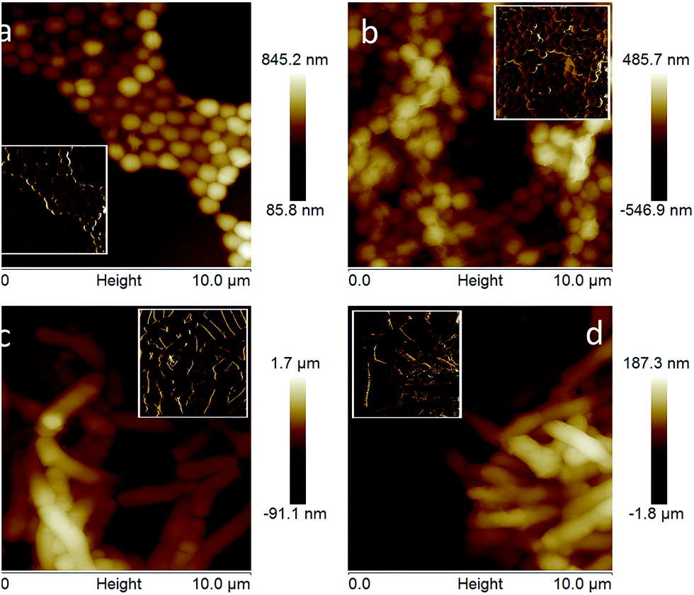 | Fig. 5 AFM images of bacteria (a) S. aureus only, (b) GO wrapped S. aureus, (c) R. opacus only, and (d) GO wrapped R. opacus. Inset images display phase images of the same samples. | ||
