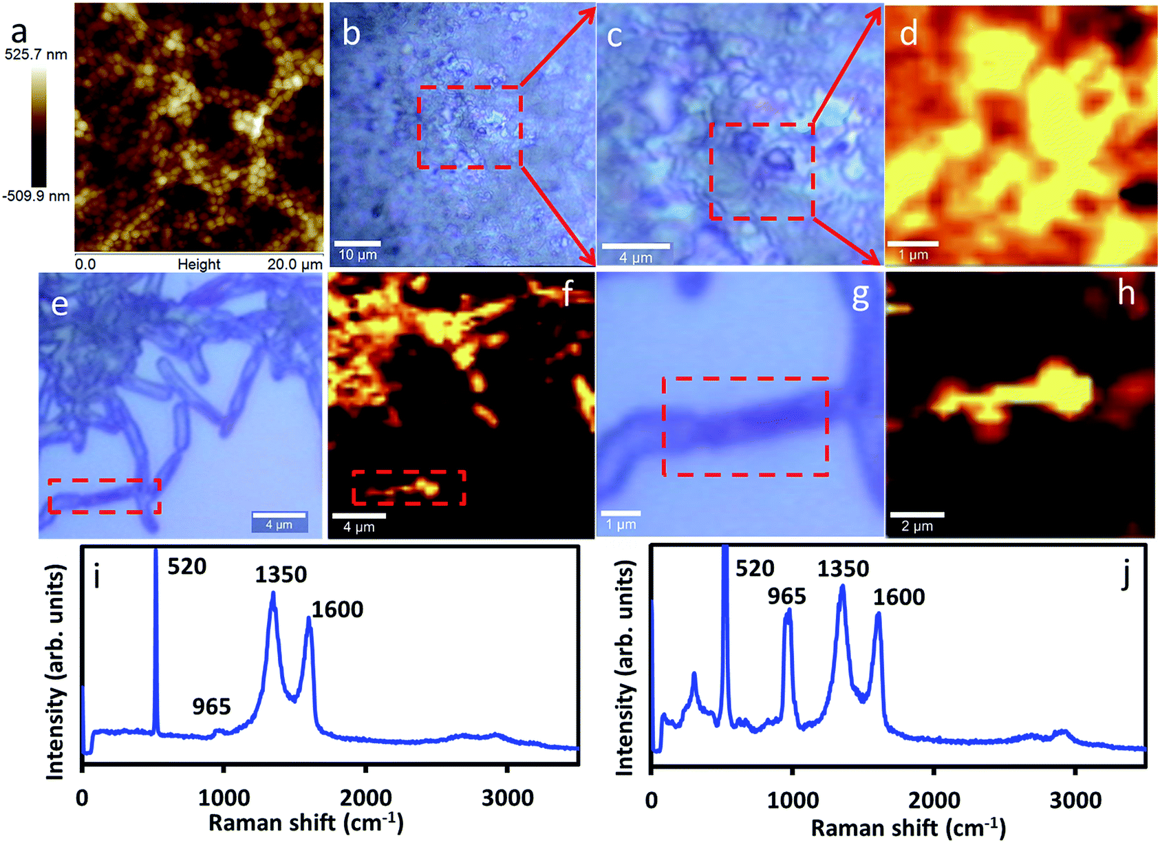 Raman spectra and images of GO wrapped bacteria are shown in Fig. 6, with Fig. 6(b) and (c) showing ×100 optical microscope images of GO wrapped S. aureus deposited on a cleaned silicon surface. The surface coverage of the S. aureus is quite high and given their small size (approximately 1 μm or less) it is difficult to discern individual bacteria. AFM images were acquired in approximately the same region as these optical micrographs and show the typical shape and structure of the S. aureus bacteria (Fig. 6(a)). Fig. 6(d) is a Raman image plotting the intensity of the 1600 cm−1 peak typical for the graphitic band of GO. Clearly from the bright regions on Fig. 6(c), the GO is covering the S. aureus bacterial surface. Fig. 6(i) is a Raman single spectra acquired on the image and shows the distinctive peaks of the D and G bands, at 1350 and 1600 cm−1 respectively, for GO, being consistent with previously reported values.50 The peaks at 520 and 965 cm−1 are also shown, which are from the underlying silicon substrate. Fig. 6(e)–(h) and (j) show optical images, Raman images and a Raman spectrum for the R. opacus bacteria covered in GO. Fig. 6(e) is an optical image and due to the much larger size of the rod-shaped R. opacus (1 μm wide and ∼4–5 μm long) they are easily discernible using the ×100 objective on the Raman microscope. Fig. 6(f) shows the same region as the image in Fig. 6(e) as a Raman image generated from the GO graphitic band at 1600 cm−1. The bright regions again indicate the presence of GO on the bacteria, which coincide with the position of the bacteria. Fig. 6(g) and (h) are zoomed in optical and Raman images of a particular bacterium, highlighted in Fig. 6(e) and (f). The data in Fig. 6(g) and (h) further demonstrate the covering of the bacteria with GO. The Raman image in Fig. 6(h) is, once again, corresponds to the GO graphitic band at 1600 cm−1. Fig. 6(j) shows a typical spectrum from the image and shows the distinctive peaks D and G bands at 1350 and 1600 cm−1 respectively for GO.52