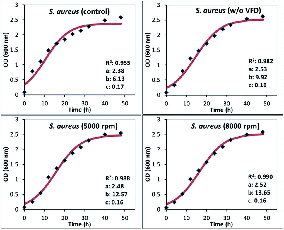 | Fig. 7 Bacterial growth curves for S. aureus cells regrown in nutrient media after wrapping with GO. Inset information of each figure shows the logistic model constants of eqn (1) (a, b, and c), and the coefficient of determination (R2). | ||